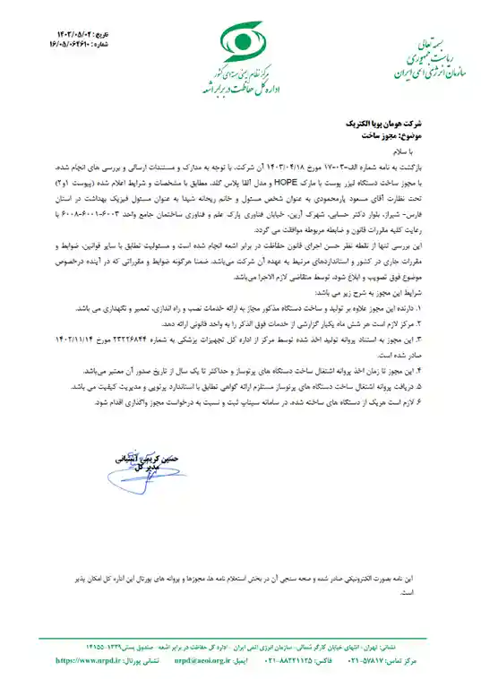 شركت دانش بنيان هومان پويا الكتريک با نام اختصاری HOPE تنها تولید کننده تجهیزات پزشکی (لیزر موهای زائد) در جنوب کشور می باشد که با بهره گیری از دانش متخصصین و مهندسین برتر کشور با تحصیلات عالی و مرتبط با تجهیزات پزشکی، قادر به تولید به روزترین و با کیفیت ترین دستگاه های لیزر روز دنیا گردیده است. هدف اصلي اين شركت طراحي و ساخت تجهيزات پزشكي با تكنولوژي بالا (high-tech) و با بالاترين كيفيت و همچنين ارائه خدمات پس از فروش در خور جامعه پزشكي كشور می باشد.