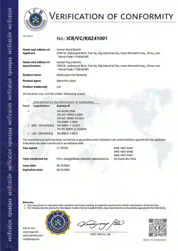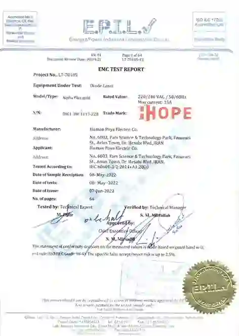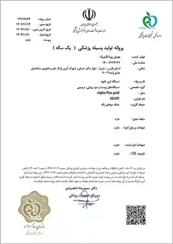دستگاه لیزر موهای زائد آلفا پلاس تولید شرکت هومان پویا الکتریک مد 1200 وات دارای مجوز تولید از وزارت بهداشت، درمان و آموزش پزشکی و تنها دستگاه لیزر ایرانی دارای استاندارد بین المللی CE اروپا، جدیدترین و قدرتمندترین دستگاه موجود در بازار است که به شما این امکان را میدهد که تجربهای سریع و موثر در حذف موهای زائد داشته باشید. این دستگاه با تکنولوژی پیشرفته و قابلیت کار با سرعت بالا، به شما این امکان را میدهد که بدون درد و با عوارض حداقلی به نتایج مطلوب برسید. یکی از ویژگیهای بینظیر این دستگاه، سیستم خنککنندهی قوی آن است که باعث می شود جلسه لیزر بدون دردی تجربه کنید.